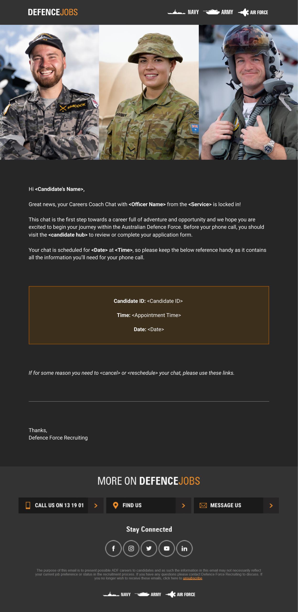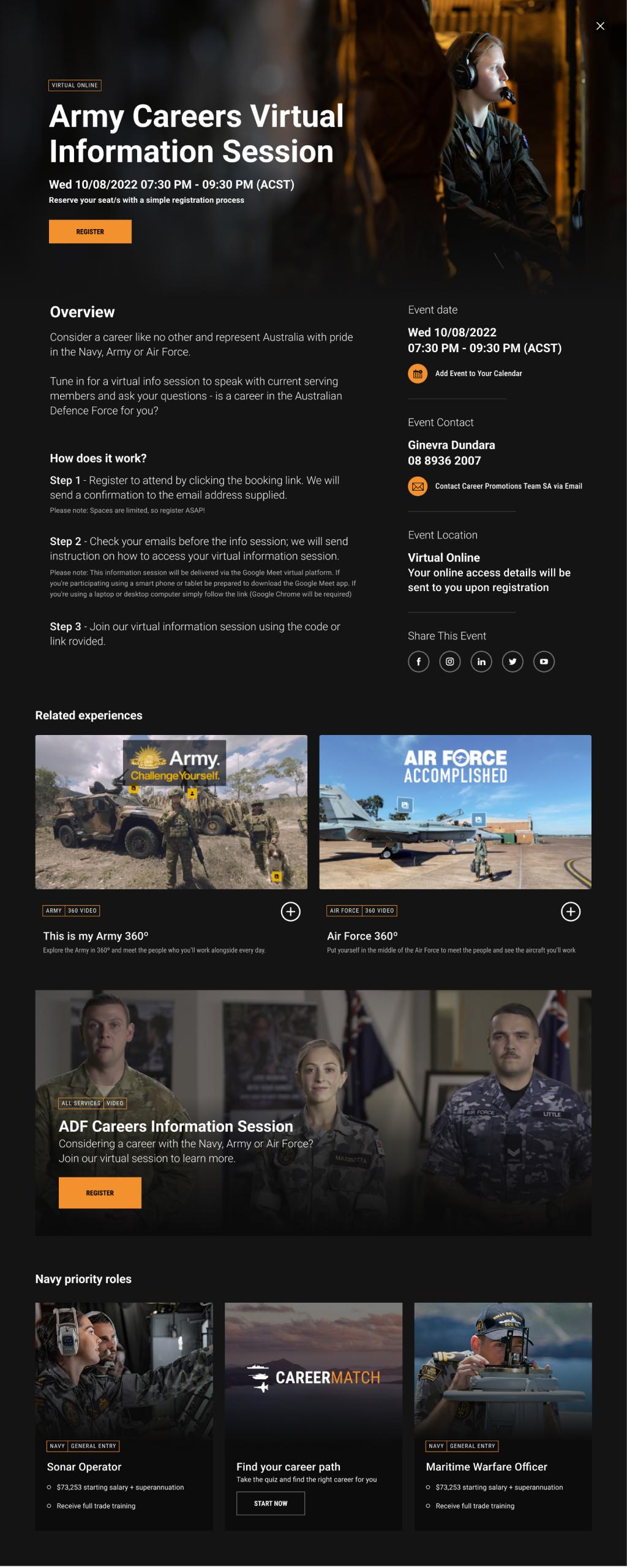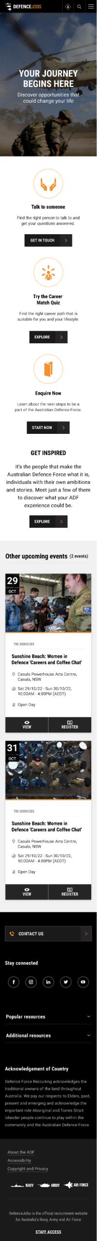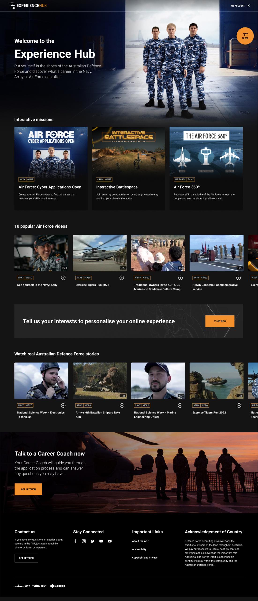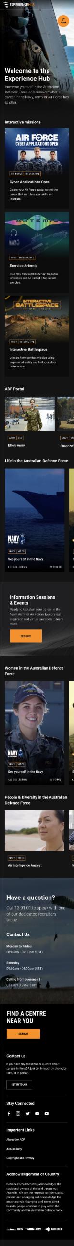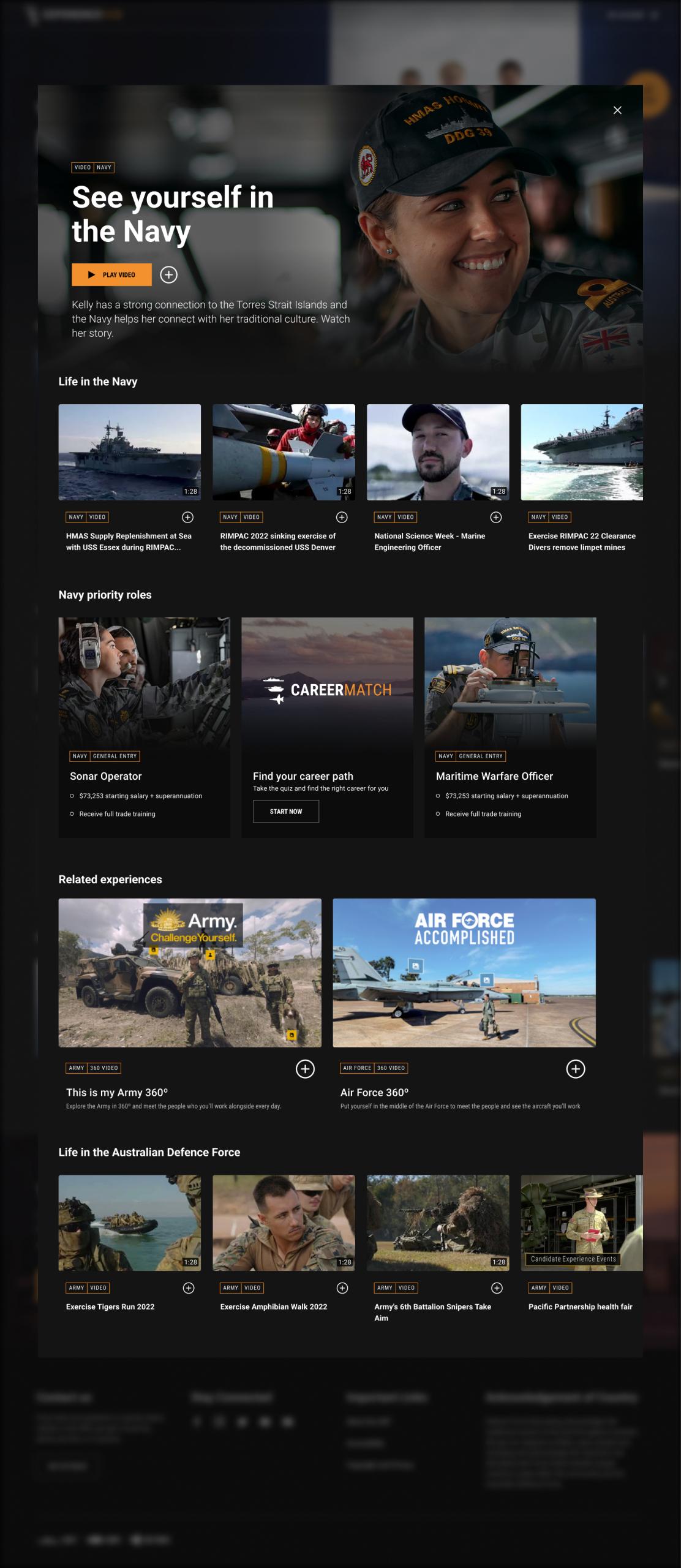 I was contracted to VMLY&R to primarily work on the Defence Force Recruitment website which at the time was the biggest website build in Australia. I was solely in charge of designing the UI for the new Experience Hub which was a Netflix inspired entertainment arm of the Defence Force. I also worked across many other areas such as updating current pages, organizing assets libraries and email layout and design.